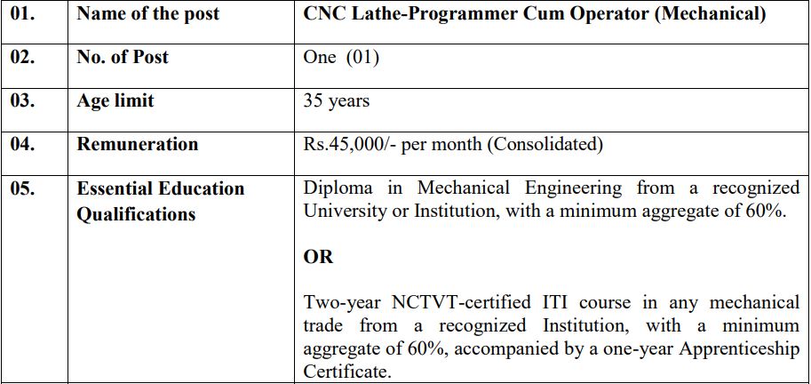 | Designation | CNC Lathe-Programmer Cum Operator | Age Limit | Maximum - 35 Years (Age relaxation is applicable as IIA) | ||||