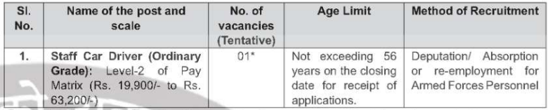 | Designation | Staff Car Driver | Age Limit | Maximum - 56 Years (Age relaxation is applicable as India Post Office) | POSTS DETAIL | Advt. No. AD-91/17/2022-Admin-DOP Total Post - 01