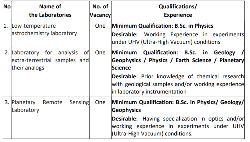 | Qualification | B.Sc. in relevant disciplines (Physics / Geology / Geophysics / Earth Science / Planetary Science) as per laboratory requirement. |