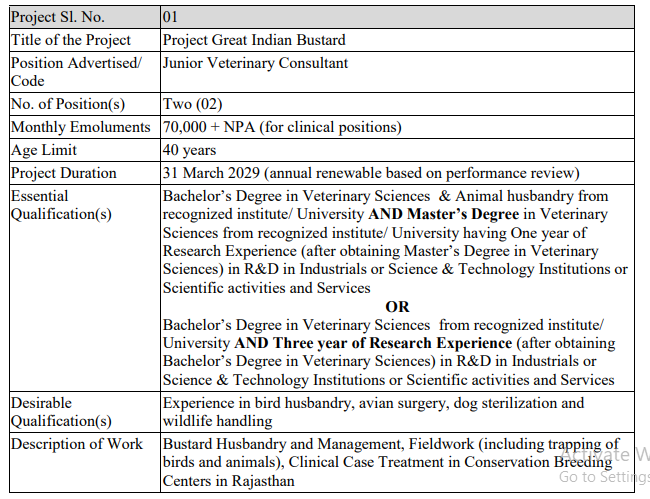 | Designation | Junior Veterinary Consultant | Age Limit | Maximum - 40 Year (Age Relaxation is applicable as per rules of WII) | ||||